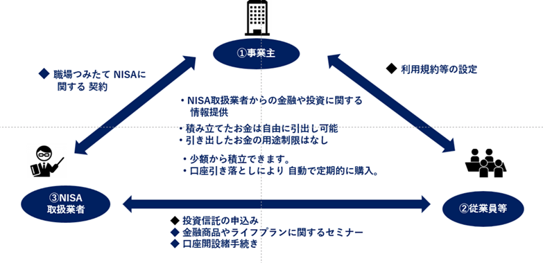 - 事業主:利用規約の設定を行い、NISA取扱業者から金融・投資に関する情報の提供を受けます