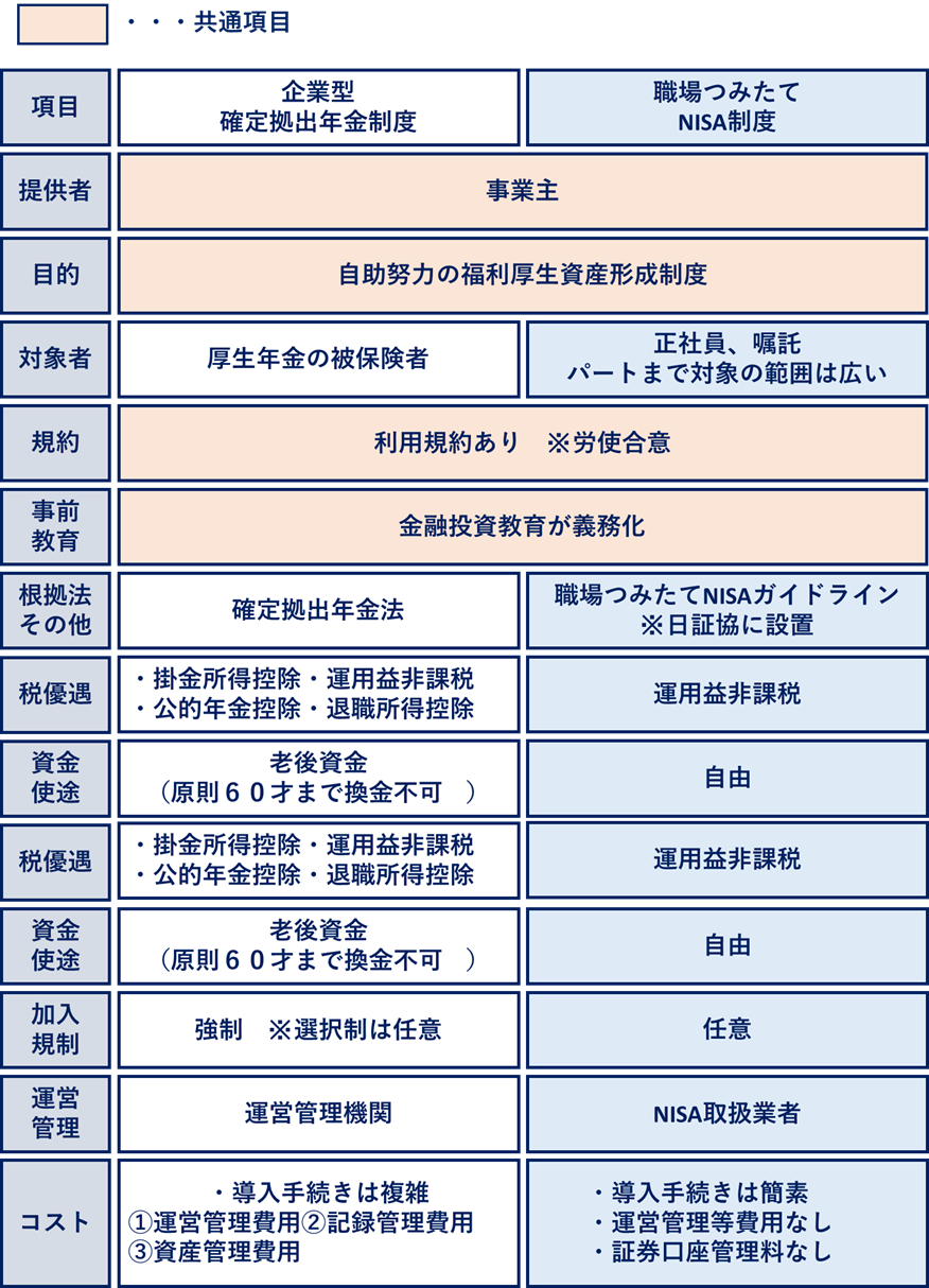 POINT: 企業型DCと共通点が多い一方で、職場つみたてNISAは「資金の引き出しが自由」という汎用性の高さが特徴です 。従業員のライフイベントに柔軟に対応できる制度として活用されています。