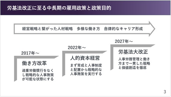しかし、この議論を見ていて筆者が強く感じるのは、2017年の働き方改革から人的資本経営を経て、2027年の労基法改正に至る一連の雇用政策の目的への理解が、社会で十分に浸透していないという現実です。