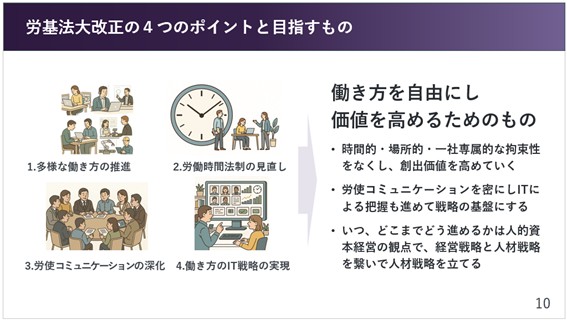 つまり、2017年の働き方改革で価値創造に集中できる土台を作り、2020年代の人的資本経営で戦略的な価値創造の仕組みを構築し、2027年の労基法改正で価値創造型の働き方を法的に確立する。この10年にわたる改革は、日本の働き方の価値の向上へ転換させるという一貫した目的のもとに進められてきたのだと捉えられます。