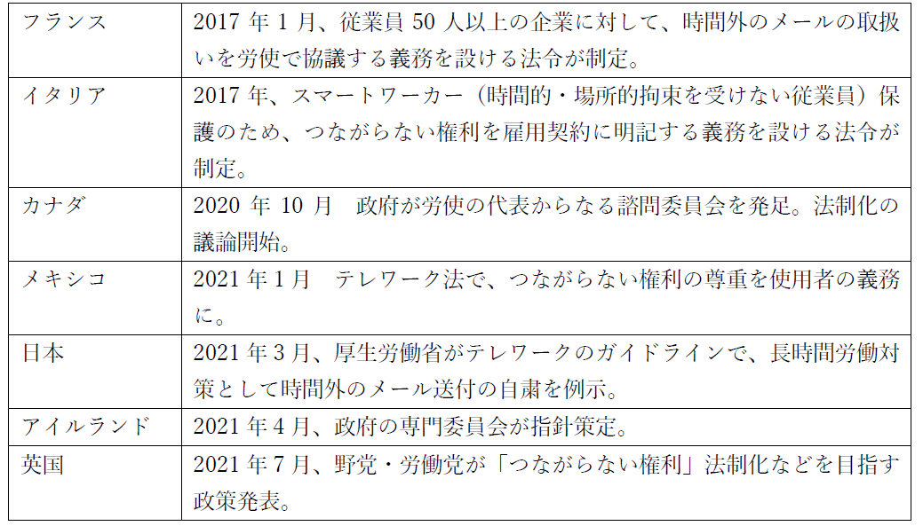 働き方の変化によって、仕事のオンとオフの境界線が曖昧になってしまうことへの懸念から、今回のような法律が制定されたという背景があります。