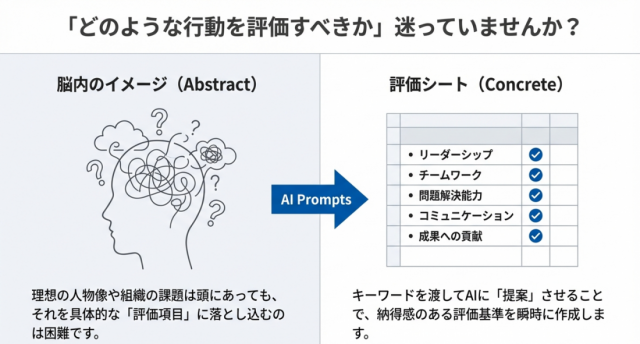 生成AIを活用し、特定の職種や等級に求められる行動特性(コンピテンシー)を自動生成するための専用プロンプトを収録。ゼロから考える苦労をなくし、叩き台を瞬時に作成します。