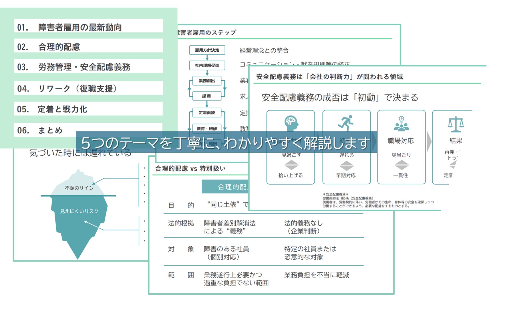 - 障害者雇用:法定雇用率アップの対応(2026年7月施行)、採用後の定着支援や業務分担、フォロー体制の整備