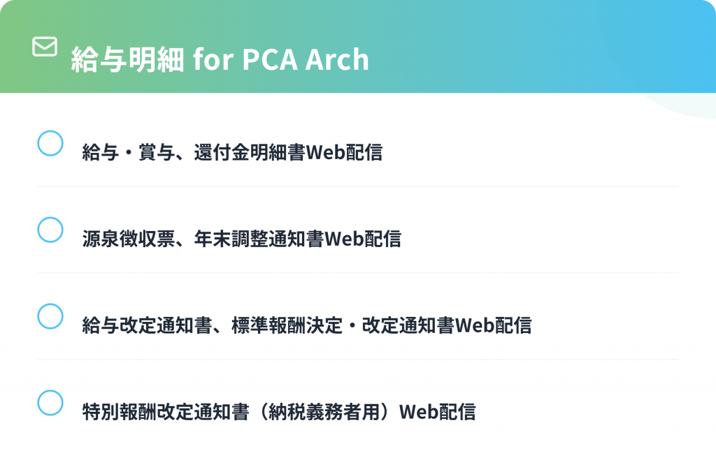 『PCA Arch 人事労務』と『給与明細 for PCA Arch』を利用することで、電子データの特別徴収税額通知書をWeb上でまとめて従業員に配付することが可能です。