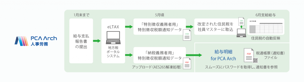 前年度の給与支払報告書の提出を電子申告で行うと、翌年の特別徴収税額通知(特別徴収義務者用)をデータで取得することが可能です。取得した特別徴収税額通知データは、『PCA Arch 人事労務』に取り込むことができるため、毎年大変だった住民税の入力が不要になります。住民税の特別徴収税額通知(納税義務者用)もデータで取得することが可能です。