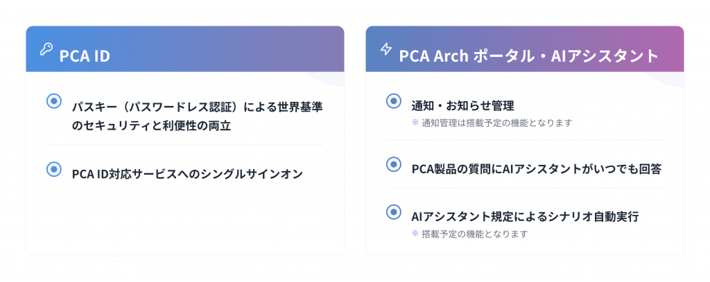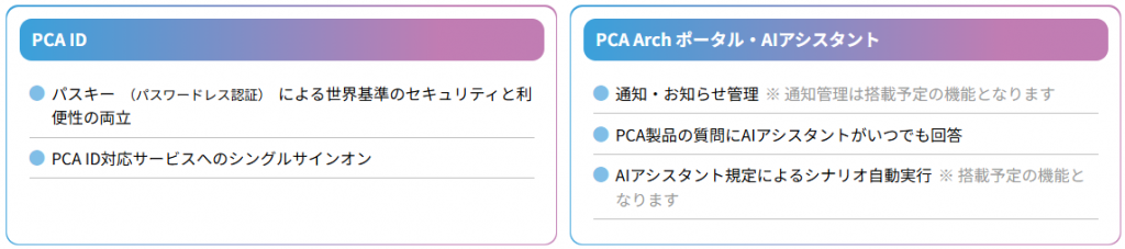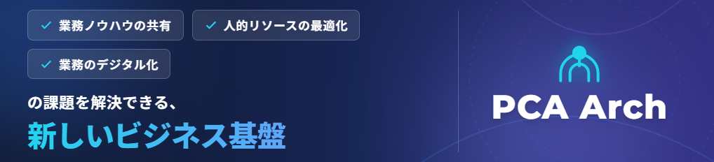 人(経営者・業務担当者・従業員・専門家)、サービス(PCA製品や他社サービス)、そして情報(ナレッジや業務ノウハウ)をつなぐ架け橋となり、AIなどの最新技術を活用して、財務経理を支援する『PCA Arch 財務経理 』、人事労務を支援する『PCA Arch 人事労務』、販売管理を支援する『PCA Arch 販売管理』の3つの業務サービスで構成されています。