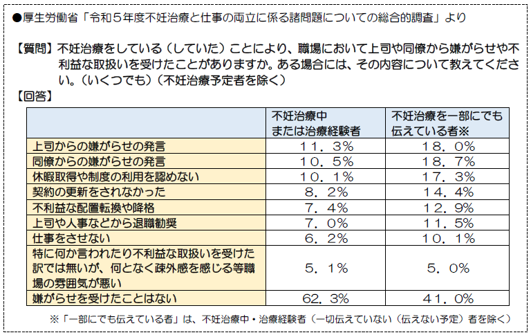 厚労省調査では、不妊治療中または治療経験者の約4割が、さらに不妊治療を一部にでも伝えている者については約6割が、何かしらの嫌がらせや不利益な取扱いを受けたと回答しています。